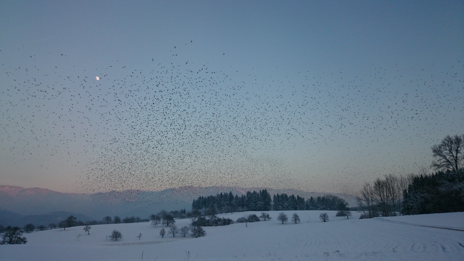 Nach vielen Einzelbeobachtungen großer Trupps im Dezember entdeckte E. Meyer am 31.12.2014 den derzeit mit grob geschätzt 2-3 Mio. Vögeln besetzten Schlafplatz am Dinkelberg zwischen Hasel und Schopfheim LÖ.